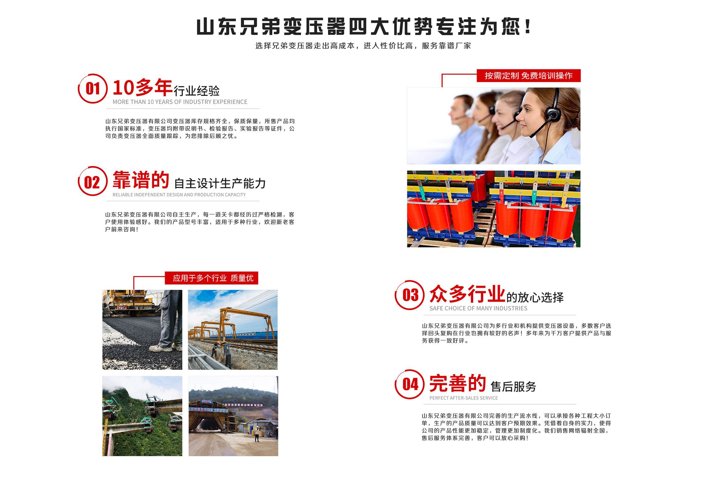 山東兄弟變壓器有限公司經營SCB10干式變壓器,SCB11干式變壓器價格,SCB12變壓器,SCB13干式變壓器,SCB14干式變壓器,SCB18干式變壓器等產品及用戶要求的特殊變壓器。 公司的質量方針是:“顧客的滿意,是我公司的追求。”堅持質量,用戶至上,以質興業,以優取勝,愿為廣大用戶設計各種要求的變壓器,以求共同發展。 企業精神:“創新、求實、誠信、高效”。 企業作風:“嚴、細、實、快”?! ∑髽I工作方針:“加強內部管理,夯實基礎,全面提高職工整體素質,使企業管理水平再上新的臺階”?! 」?..